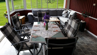 Ikväll kommer det 8 vänner till oss. Vi har dukat på altanen och ska snart börja grilla kyckling. Trevligt att sitta på altanen och titta ut på omgivningen och prata.
